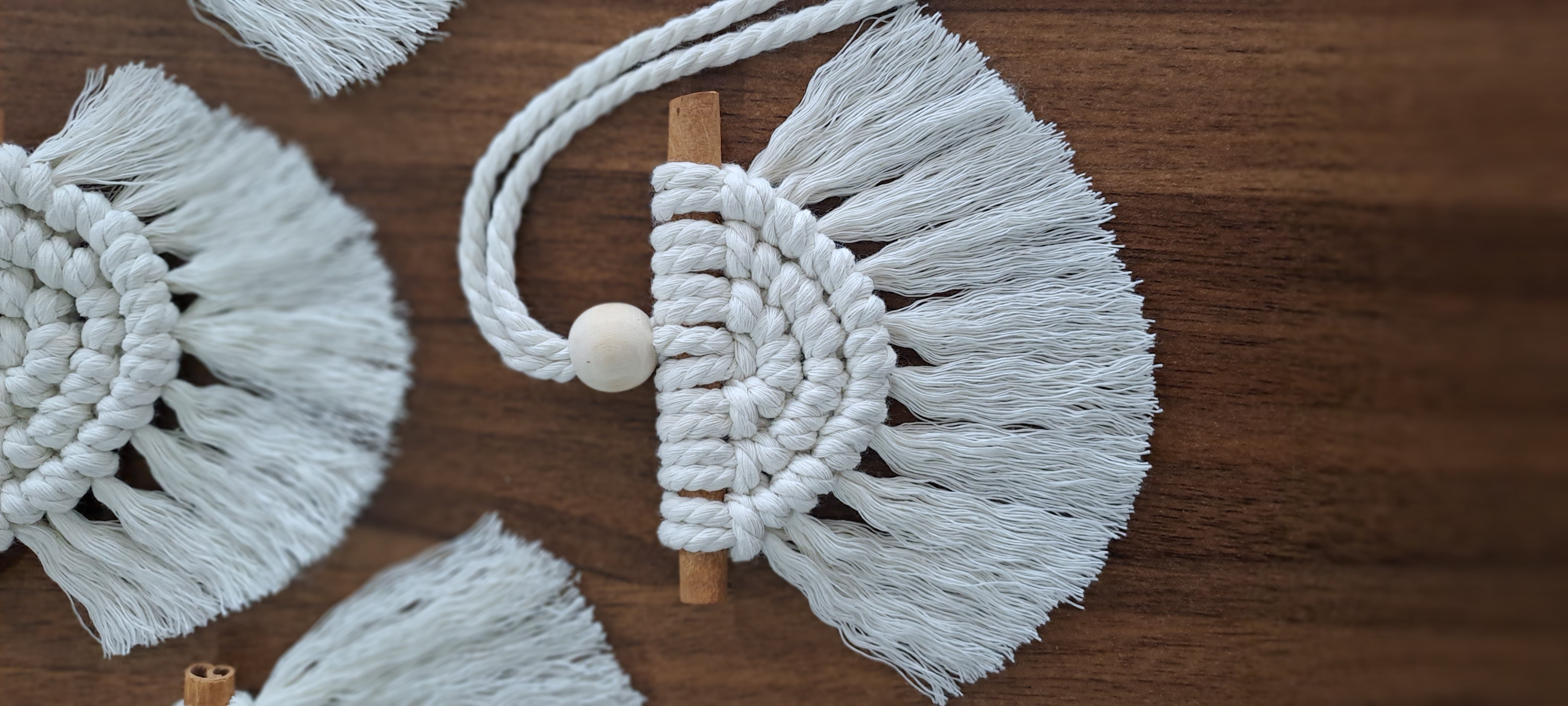 مینی آویز مکرومه با چوب دارچین و مهره چوبی مناسب برای گیفت، آینه ماشین، درب ورودی، درب اتاق، آشپزخونه و فضاتون خوش انرژی و معطر(دارچین)