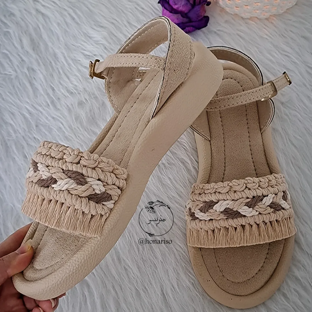صندل مکرومه دستبافت با لژ ۲/۵ سانت طبی به رنگ زمینه نخودی و پشت رکاب سگک دار. این صندل دارای پاخور راحت و شیک است و مناسب عزیزانی است که به دنبال صندل بیرونی بدون لژ و در عین حال راحت هستند.